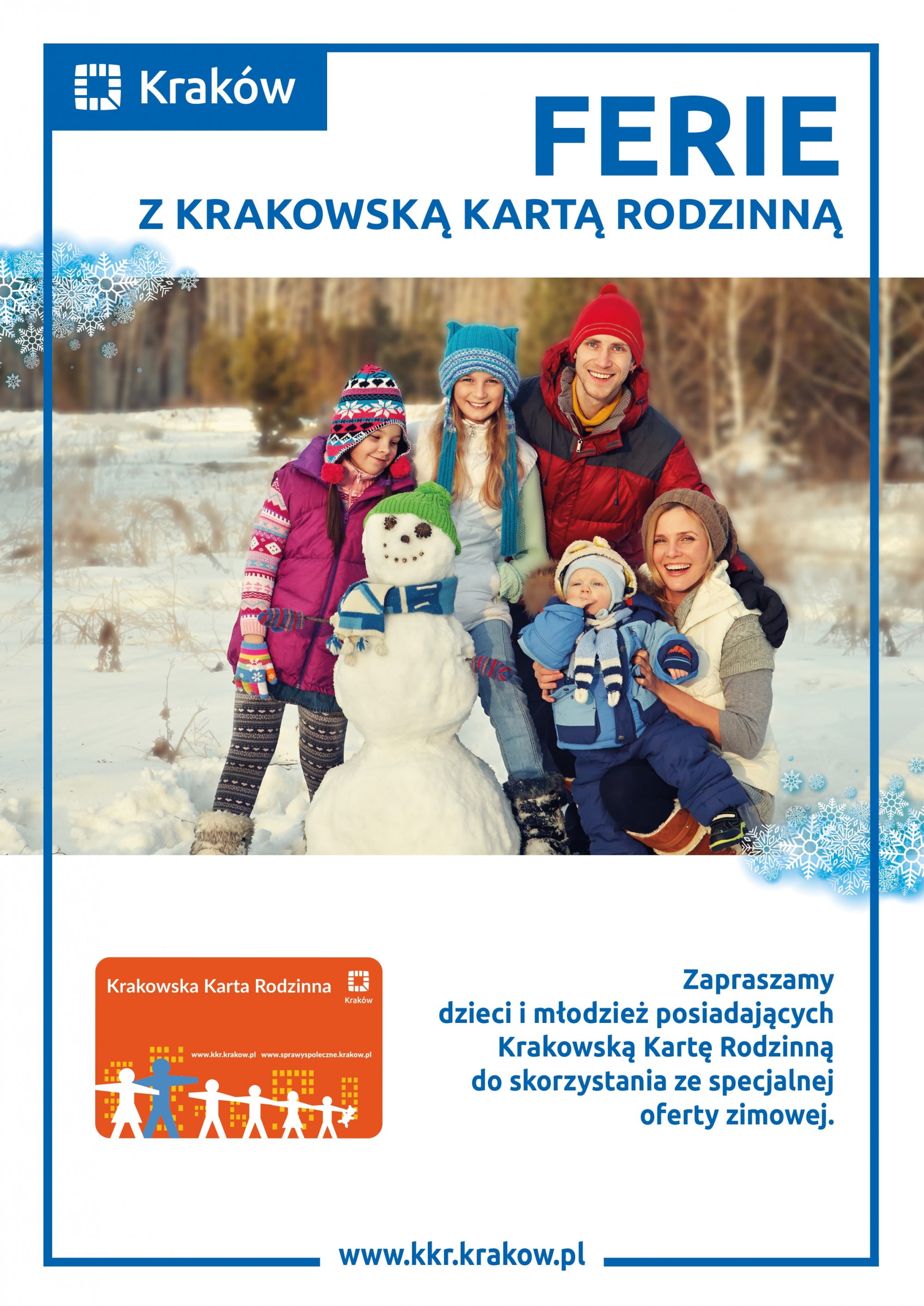 Zapraszamy dzieci i młodzież legitymujących się ważną Krakowską Kartą Rodzinną do skorzystania, w okresie ferii zimowych, tj., od dnia 30 stycznia do dnia 10 lutego 2023 r., z atrakcji przygotowanych przez Gminę Miejską Kraków i Partnerów Programu KKR 3+.