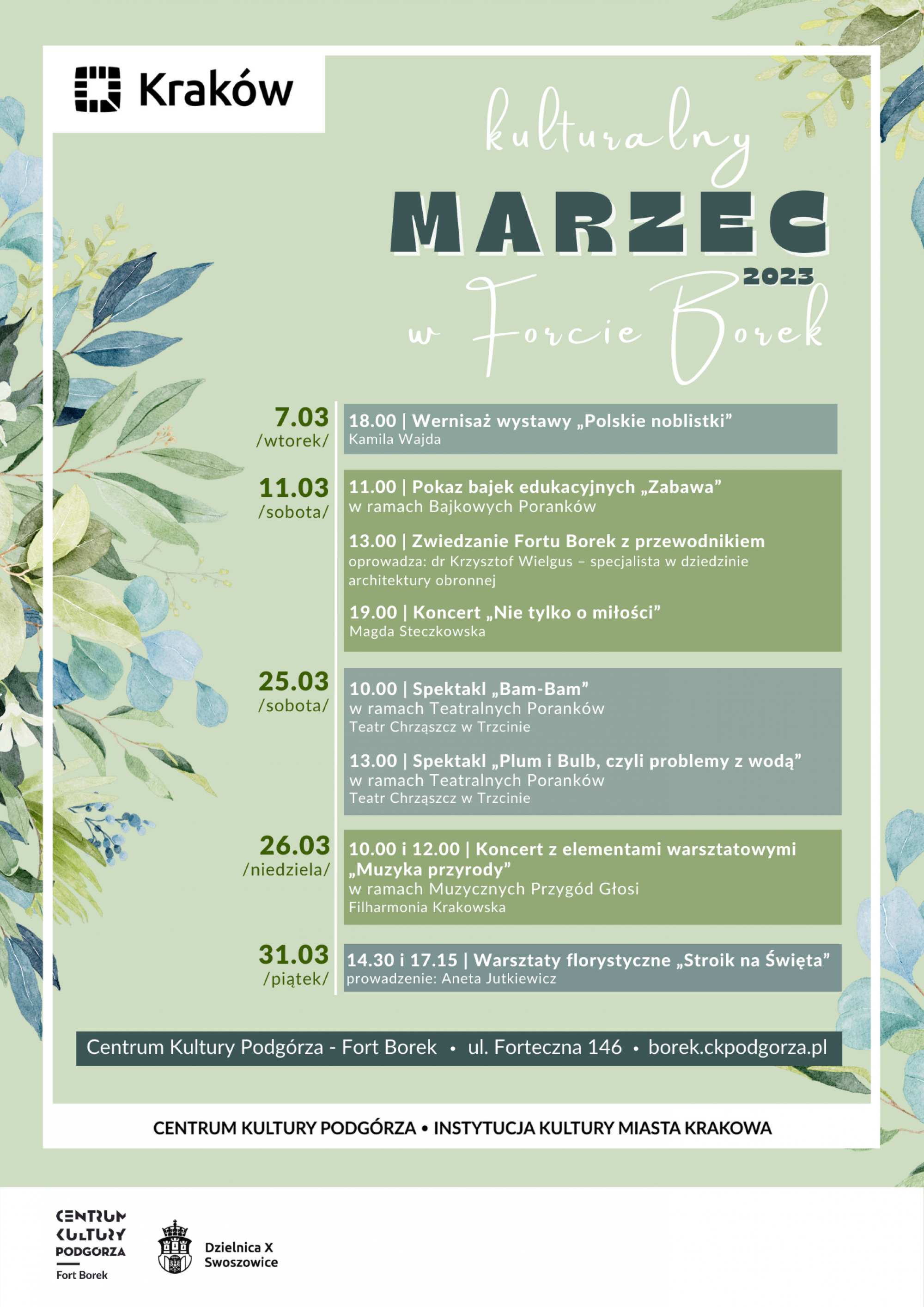 Serdecznie zachęcamy do zapoznania się z ofertą kulturalną na marzec 2023. W Forcie Borek zaplanowaliśmy cały szereg wydarzeń. Jesteśmy przekonani, że każdy znajdzie coś dla siebie.