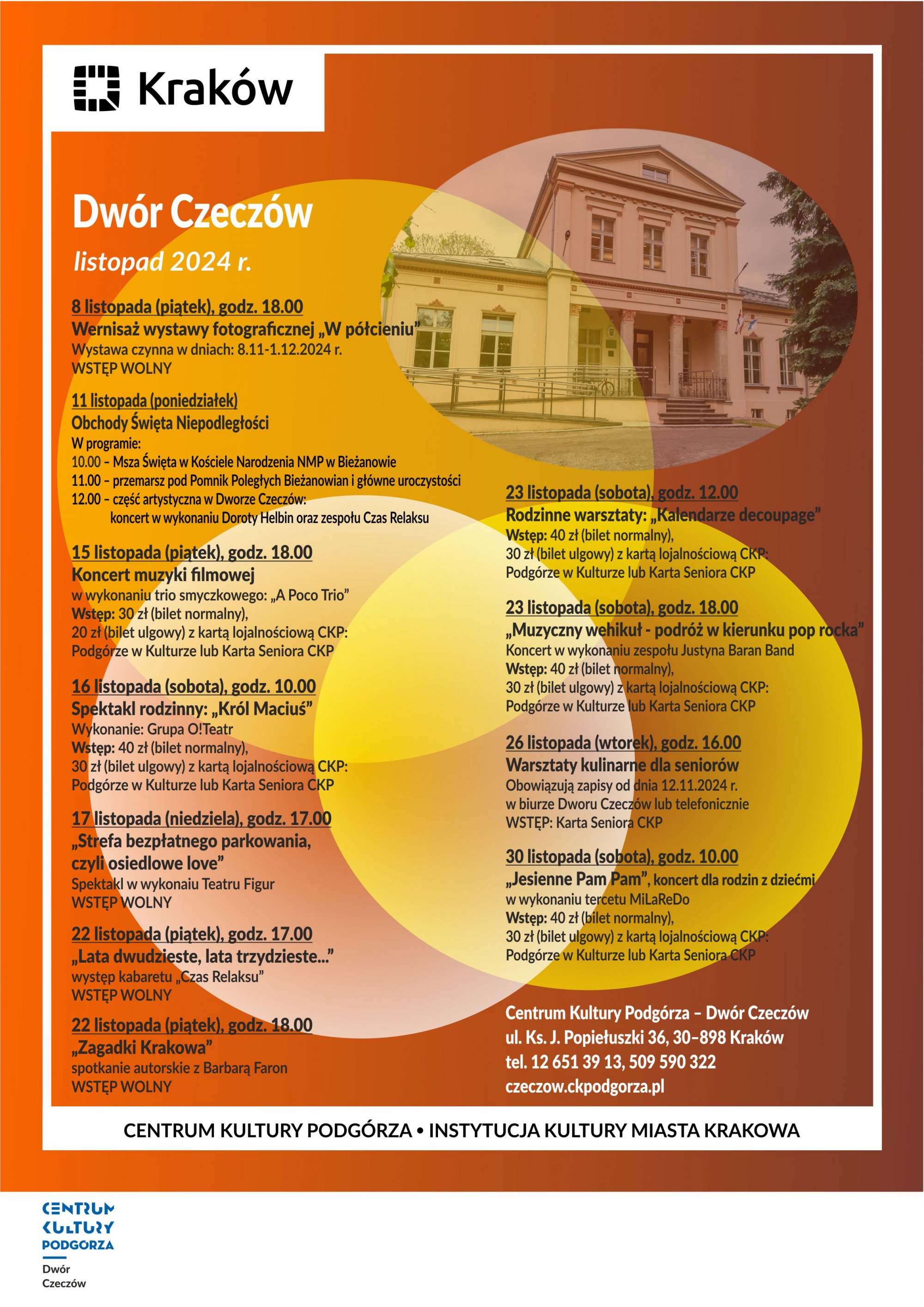 Zapraszamy na wydarzenia kulturalne organizowane w listopadzie w Dworze Czeczów: