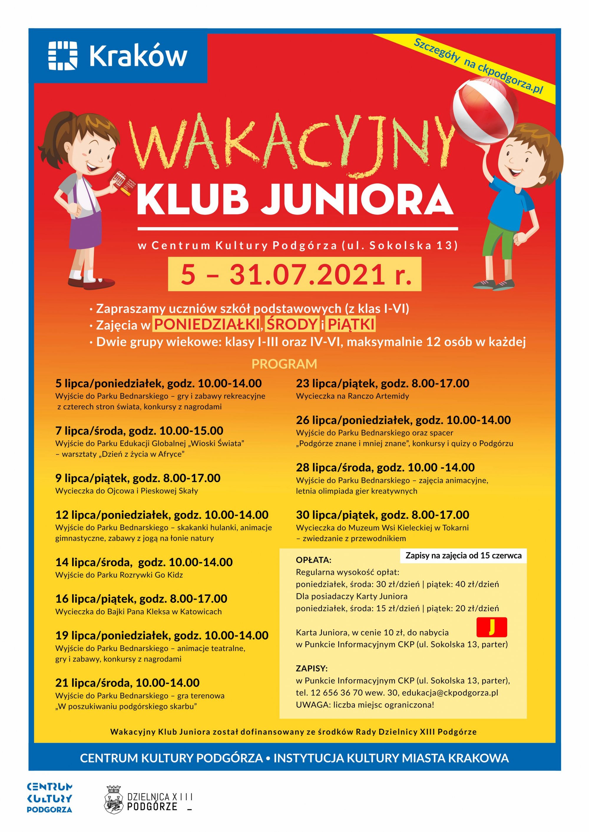 Centrum Kultury Podgórza rozpoczyna odliczanie do wakacji i zaprasza do udziału w atrakcjach przygotowanych na lipiec dla dzieci z klas I-VI. Wakacje w mieście nie tylko nie muszą być nudne, ale także mogą stać się wspaniałą okazją do poznania nowych miejsc, nauczenia się wyjątkowych umiejętności i wzięcia udziału w wyjątkowej przygodzie. Specjalnie dla dzieci, przez cztery tygodnie, organizowane będą wycieczki, warsztaty i wyjścia, a także spacery krajoznawcze i gry terenowe. Wszystkich zainteresowanych zapraszamy do zapoznania się z ofertą Wakacyjnego Klubu Juniora i Letnich Zajęć Edukacyjnych. Zapisy na wszystkie letnie zajęcia ruszają 15 czerwca, a ilość miejsc jest ograniczona. Tegoroczne wakacje najlepiej spędzić z Centrum Kultury Podgórza!