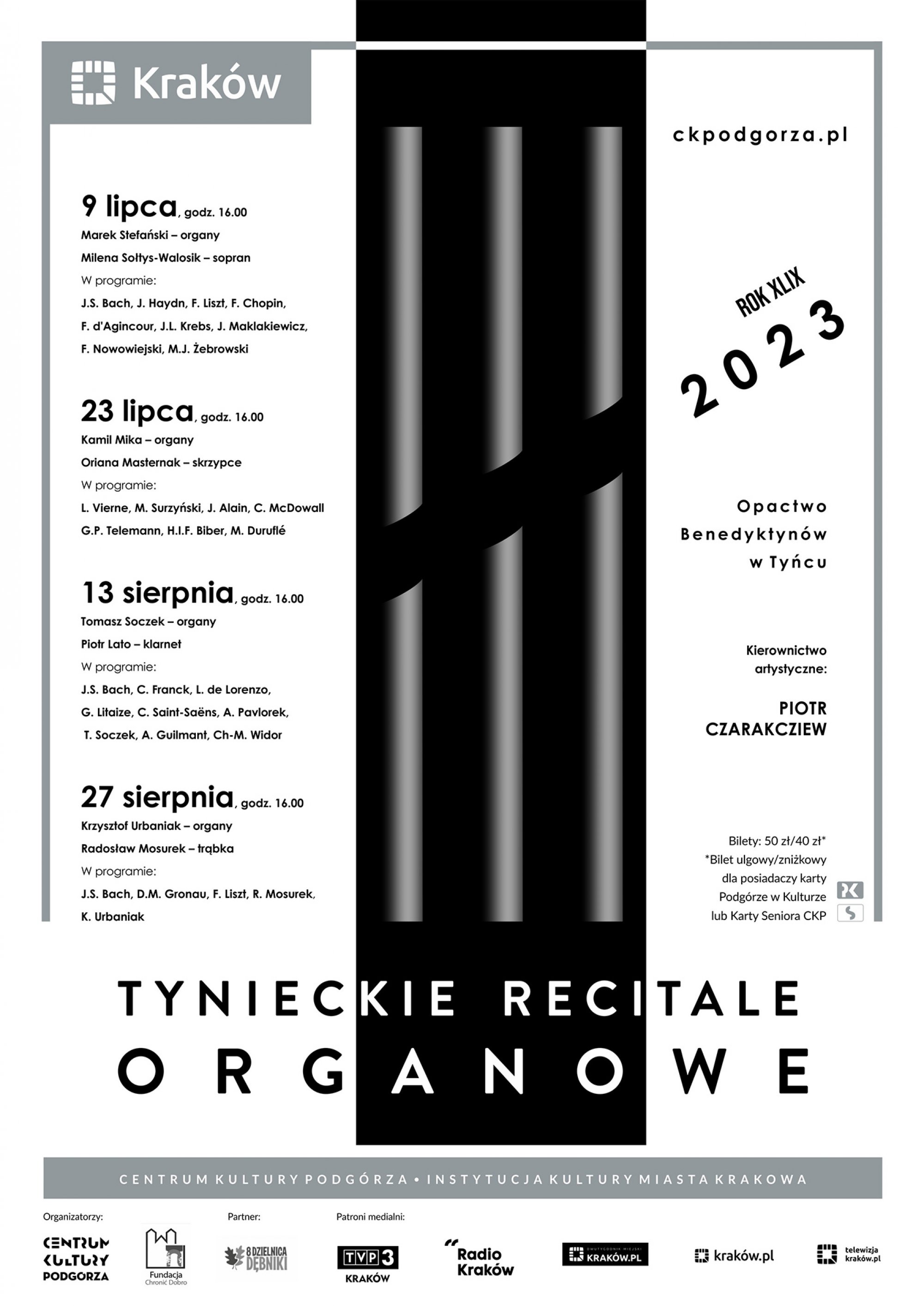 Najwspanialsze utwory muzyki klasycznej, wirtuozi organów i magia, liczącego blisko 1000 lat, Opactwa Benedyktynów w Tyńcu. Połączenie tych trzech elementów sprawia, że Tynieckie Recitale Organowe koniecznie należy wpisać do wakacyjnego kalendarza! Na koncerty w ramach tegorocznej edycji wydarzenia Centrum Kultury Podgórza zaprasza w cztery letnie niedziele: 9 i 23 lipca oraz 13 i 27 sierpnia 2023 r., o godz. 16.00. Bilety już w sprzedaży.