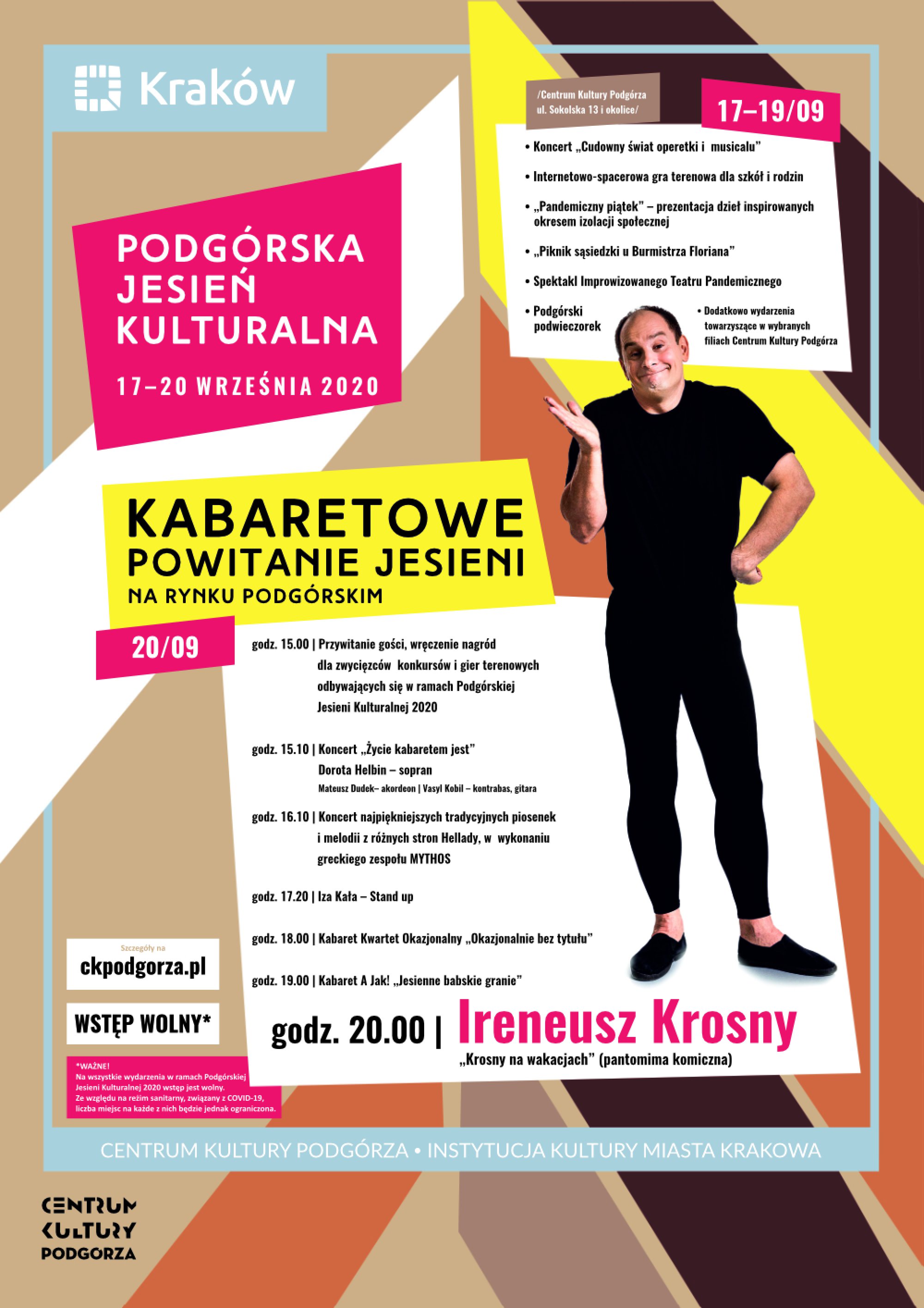 Solidna dawka dobrego humoru z mistrzem pantomimy komicznej Ireneuszem Krosnym w roli głównej. Do tego koncerty, miejska gra w nietypowej, spacerowo-internetowej formie, a także piknik sąsiedzki, wieczór wspomnień i prezentacja projektów artystycznych nawiązujących do okresu izolacji społecznej wywołanej epidemią koronawirusa. A do tego wydarzenia towarzyszące w wybranych filiach Centrum Kultury Podgórza. Zapraszamy na Podgórską Jesień Kulturalną 2020, która odbędzie się w dniach 17–20 września. Na wszystkie wydarzenia wstęp jest wolny, warto jednak pamiętać, że – ze względu na reżim sanitarny związany z COVID-19 – liczba miejsc na każde z nich będzie ograniczona.