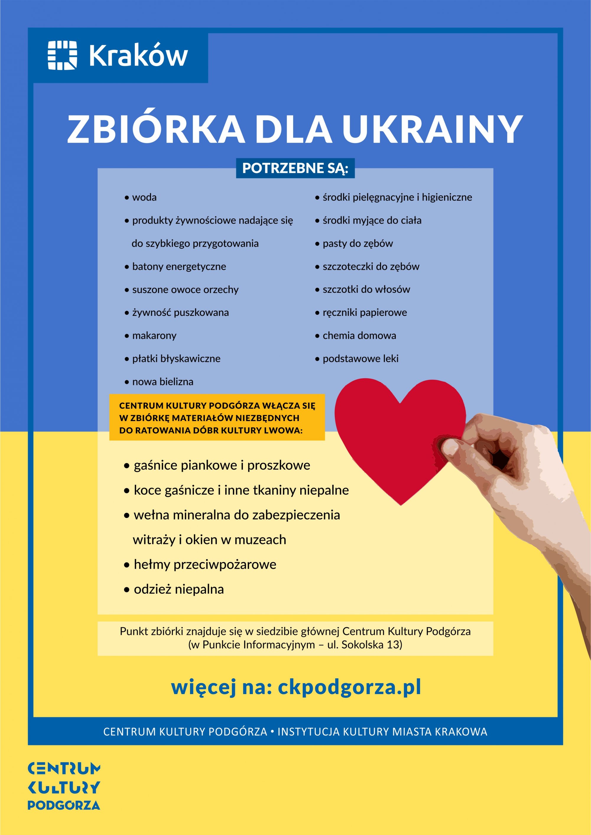 Centrum Kultury Podgórza włącza się w zbiórkę materiałów niezbędnych do ratowania dóbr kultury Lwowa. W siedzibie głównej zorganizowany został punkt, w którym można przekazać materiały gaśnicze i przeciwpożarowe, które mają posłużyć do gaszenia pożarów, a także ochrony cennych witraży. Zbiórka rozpoczęła się w 7 marca (poniedziałek). Zebrane dary będą przekazane do magazynu miejskiego przy ul. Bartników 10.