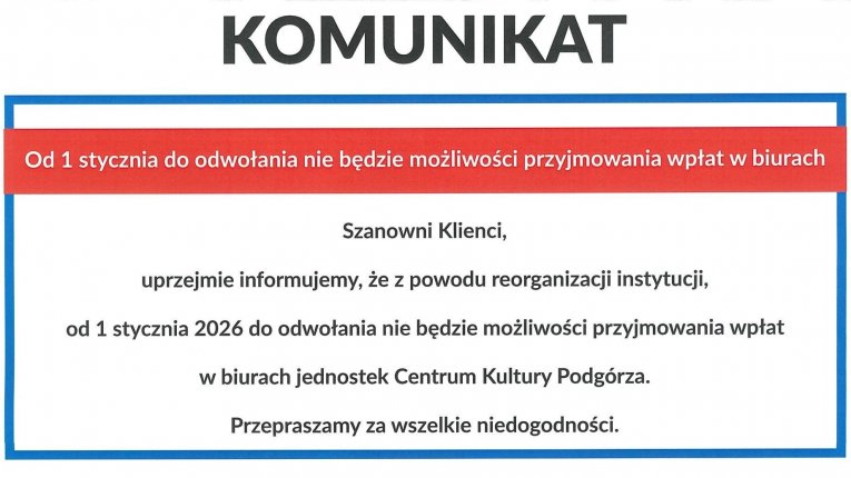 Ważna informacja - zmiana numeru konta Od dnia 9 stycznia 2026 r. w Centrum Kultury Podgórza w Krakowie obowiązuje nowy nr konta dla instytucji o numerze: