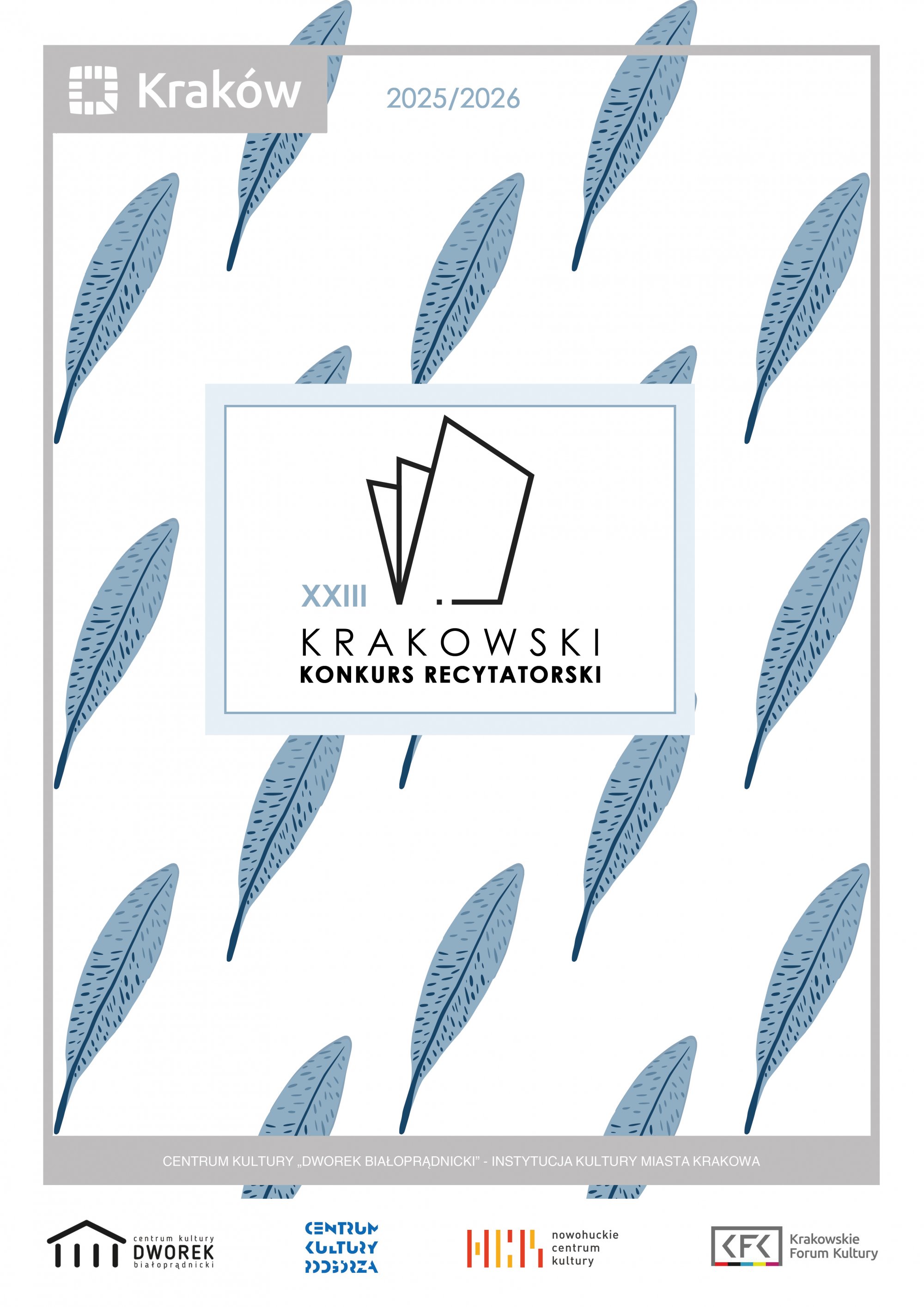 Uroczyste zakończenie XXIII Krakowskiego Konkursu Recytatorskiego odbędzie się 11 marca 2026 r. o godz. 11.00 w Centrum Kultury Dworek Białoprądnicki, ul. Papiernicza 2, 31-221 Kraków. Informacje dotyczące kolejności występu uczestników będą dostępne na stronie internetowej www.dworek.eu