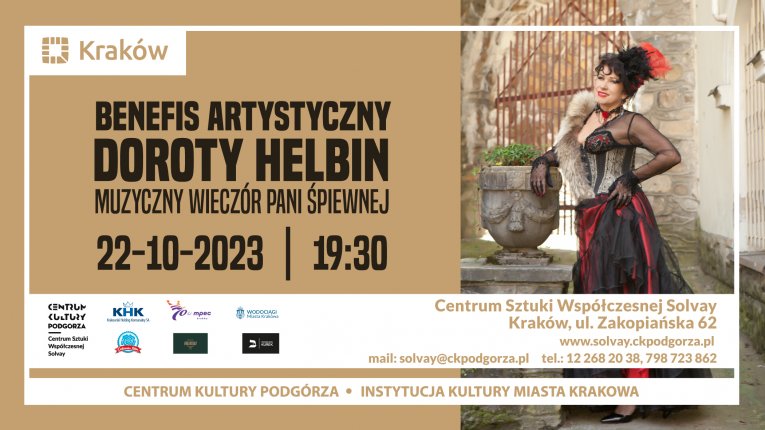 Jako urodzona krakowianka, jest doskonale znana tutejszej publiczności. Na zawodowej scenie zadebiutowała w wieku 21 lat, zachwycając swoimi wykonaniami największych operetkowych szlagierów. W tym roku Dorota Helbin – bo o niej mowa – obchodzi jubileusz 35-lecia pracy artystycznej. Z tej okazji, już niebawem – 22 października 2023 (niedziela), o godz. 19.30 – w Centrum Sztuki Współczesnej Solvay (ul. Zakopiańska 62), filii Centrum Kultury Podgórza, odbędzie się jej benefis, zatytułowany „Muzyczny wieczór Pani Śpiewnej”. Jubilatce towarzyszyć będą zaprzyjaźnieni soliści operowi i operetkowi, wokaliści musicalowi, aktorzy teatralni i filmowi oraz wspaniali, krakowscy akompaniatorzy i wirtuozi instrumentalni, z którymi miała przyjemność współpracować. Bilety na wydarzenie już w sprzedaży.
