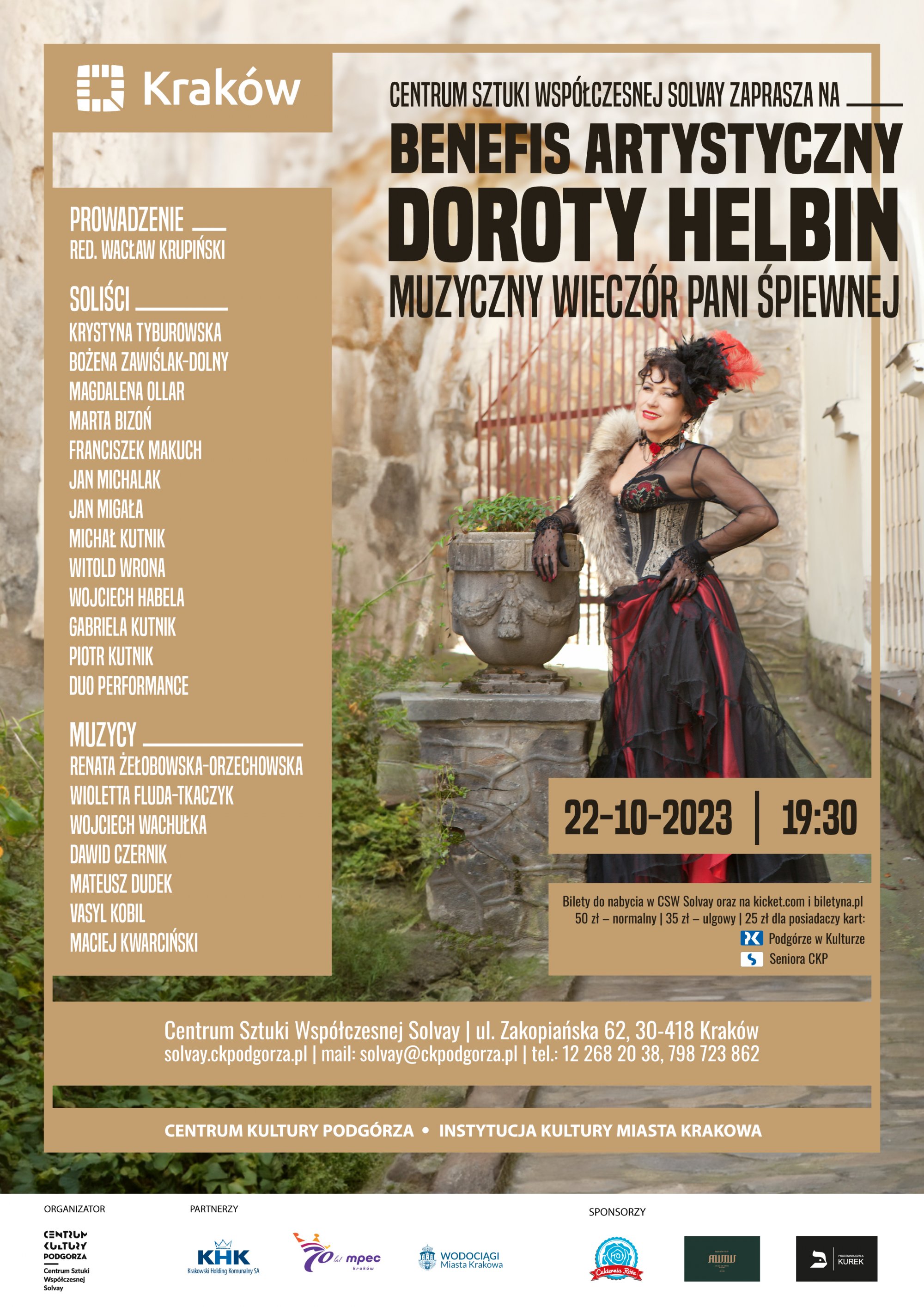 Bilety na benefis – w cenie: 50 zł (normalny)/35 zł (ulgowy)/25 zł (dla posiadaczy Karty Podgórze w Kulturze lub Karty Seniora CKP) – do nabycia w biurze CSW Solvay lub online, na: kicket.com i biletyna.pl