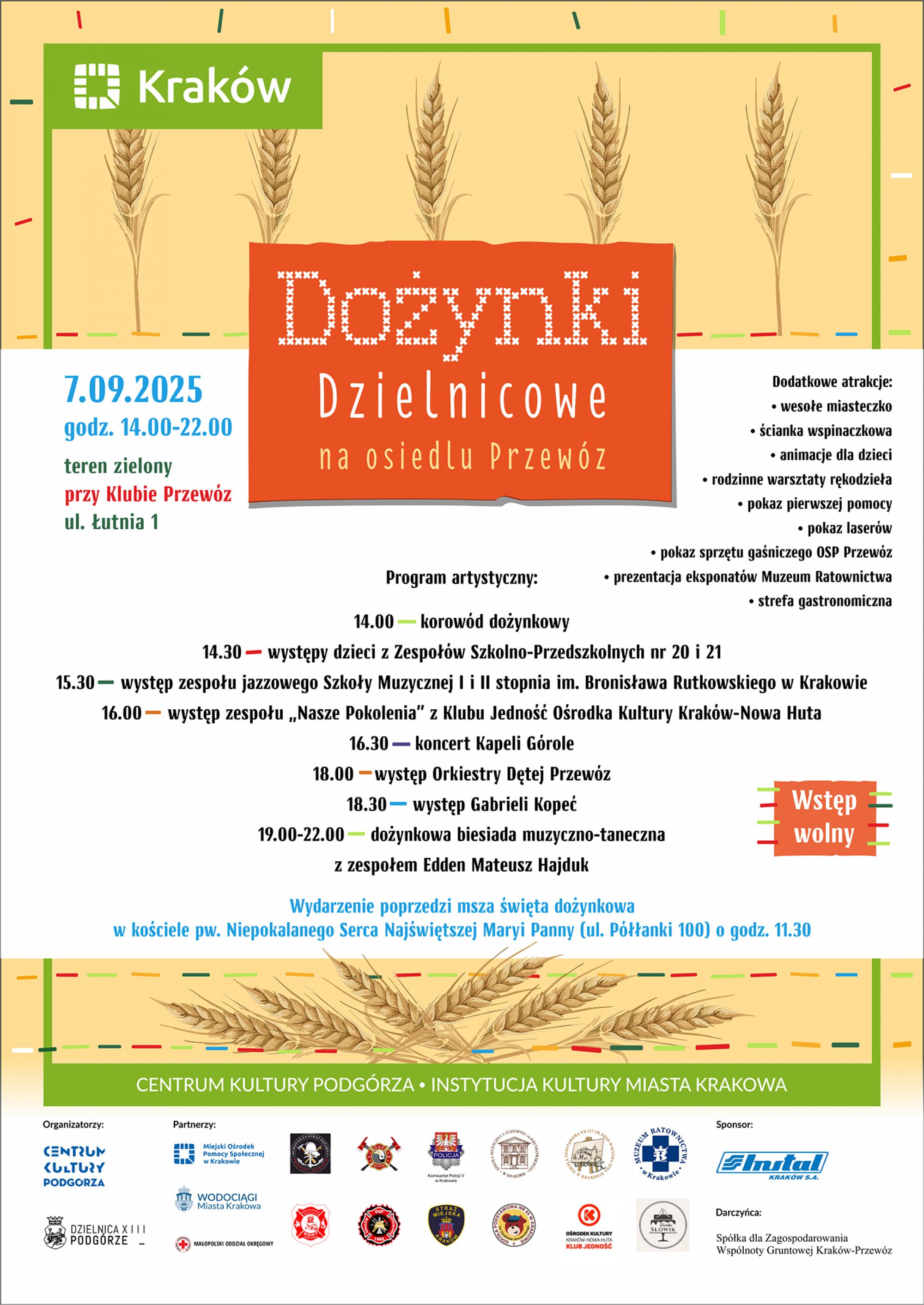 Wywodzące się ze słowiańskiej kultury ludowej święto plonów zainaugurowane zostanie dziękczynną mszą świętą w Kościele Niepokalanego Serca Maryi (ul. Półłanki 100) o godzinie 11.30, podczas której zostanie poświęcony wieniec dożynkowy oraz chleb. Po jej zakończeniu barwny korowód dożynkowy przejdzie na teren zielony przy ul. Łutnia, gdzie będziemy się wspólnie bawić od godz. 14.00 do 22.00.