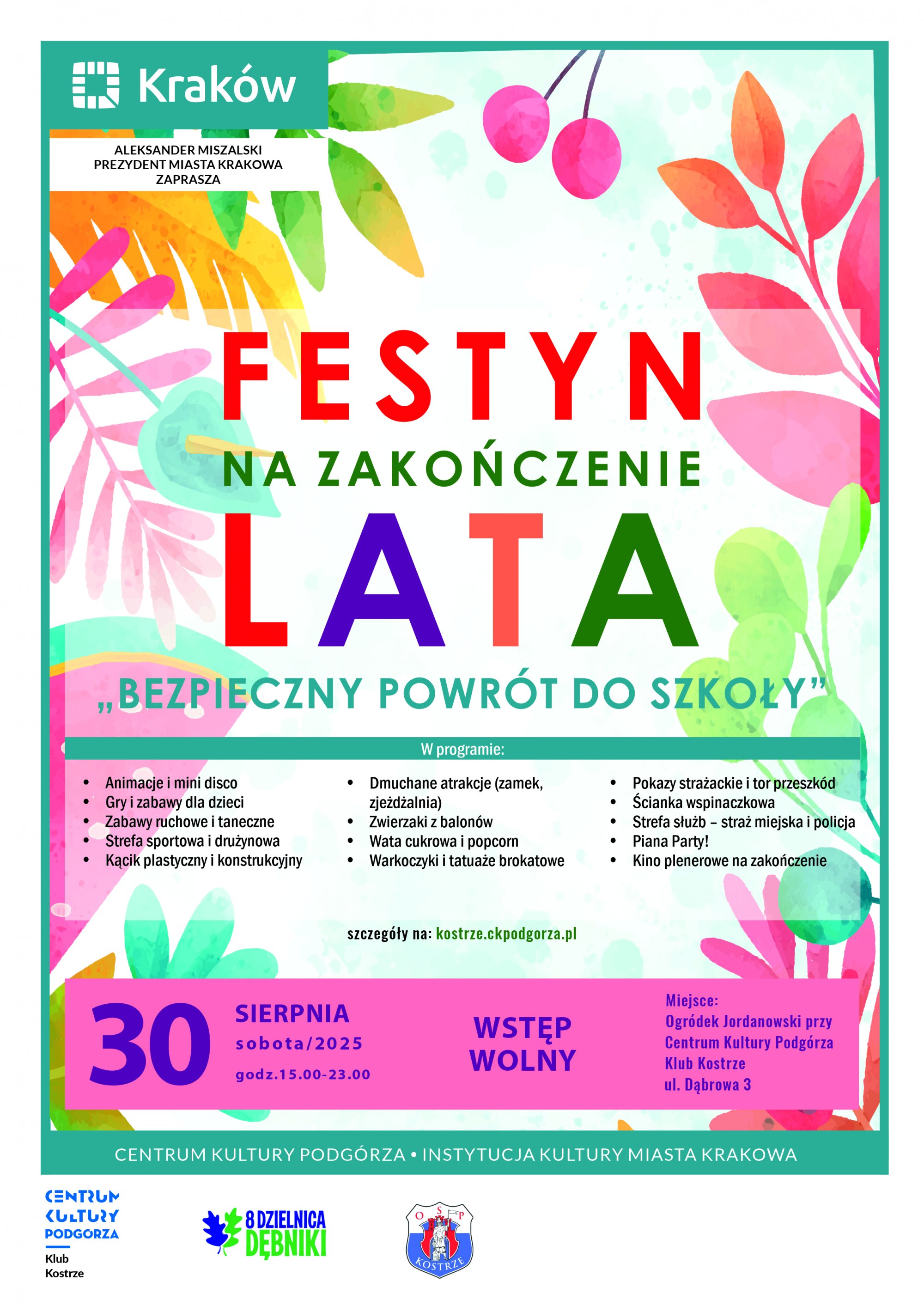 Aleksander Miszalski Prezydent Miasta Krakowa, Centrum Kultury Podgórza Klub Kostrze, Rada Dzielnicy VIII i Ochotnicza Straż Pożarna Kostrze serdecznie zapraszają na coroczny festyn z okazji zakończenia lata ,,Bezpieczny powrót do szkoły''