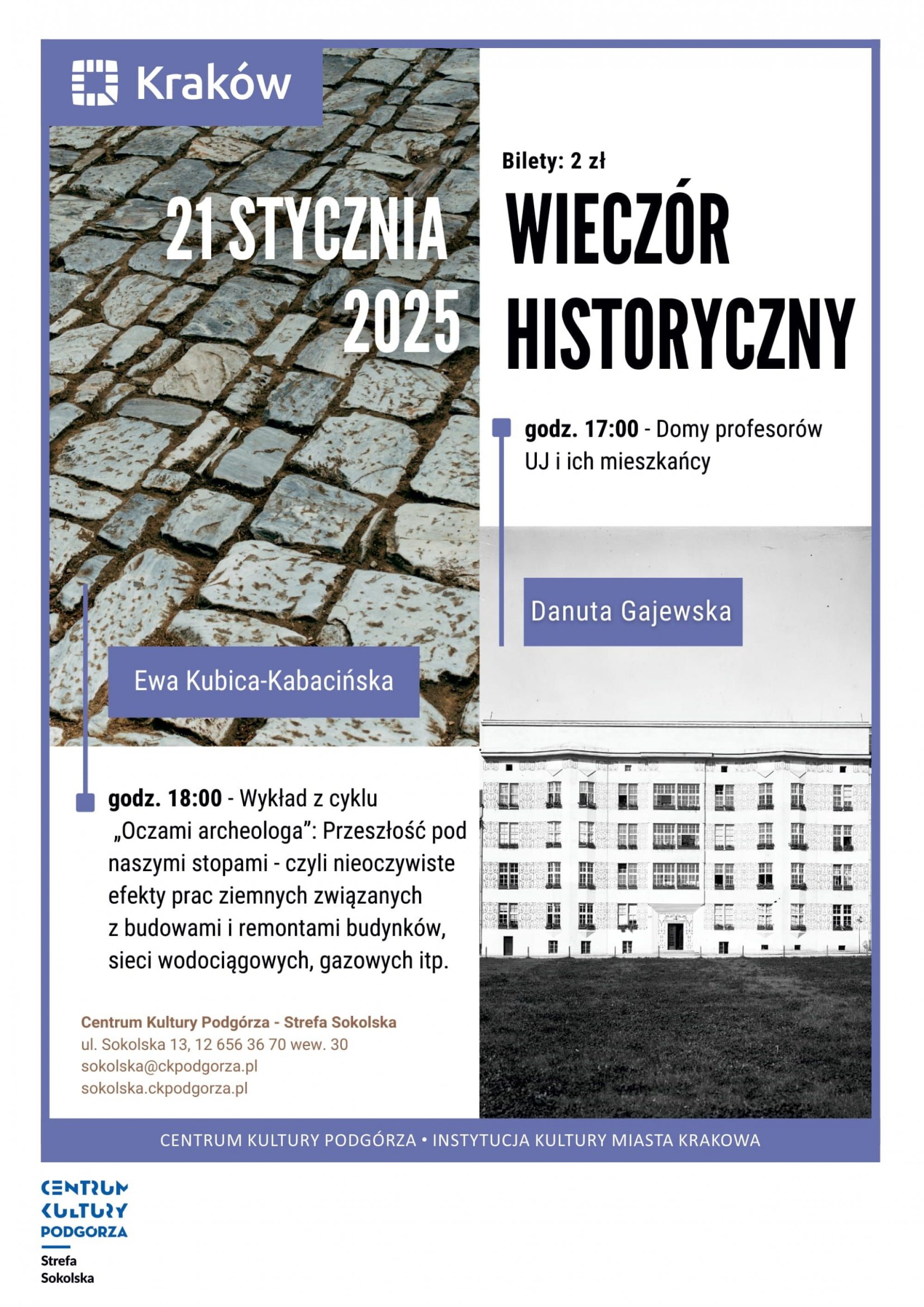 Serdecznie zapraszamy na wieczór z wykładami historycznymi, który odbędzie się 21 stycznia w Strefie Sokolska. Pierwszy z nich rozpocznie się o godz. 17.00 pt. „Domy Profesorów UJ i ich mieszkańcy” i poprowadzi go Pani Danuta Gajewska, drugi pt. „Przeszłość pod naszymi stopami - czyli nieoczywiste efekty prac ziemnych związanych z budowami i remontami budynków, sieci wodociągowych, gazowych itp. - oczami archeologa” odbędzie się o godz. 18.00 i poprowadzi go Ewa Kubica-Kabacińska.