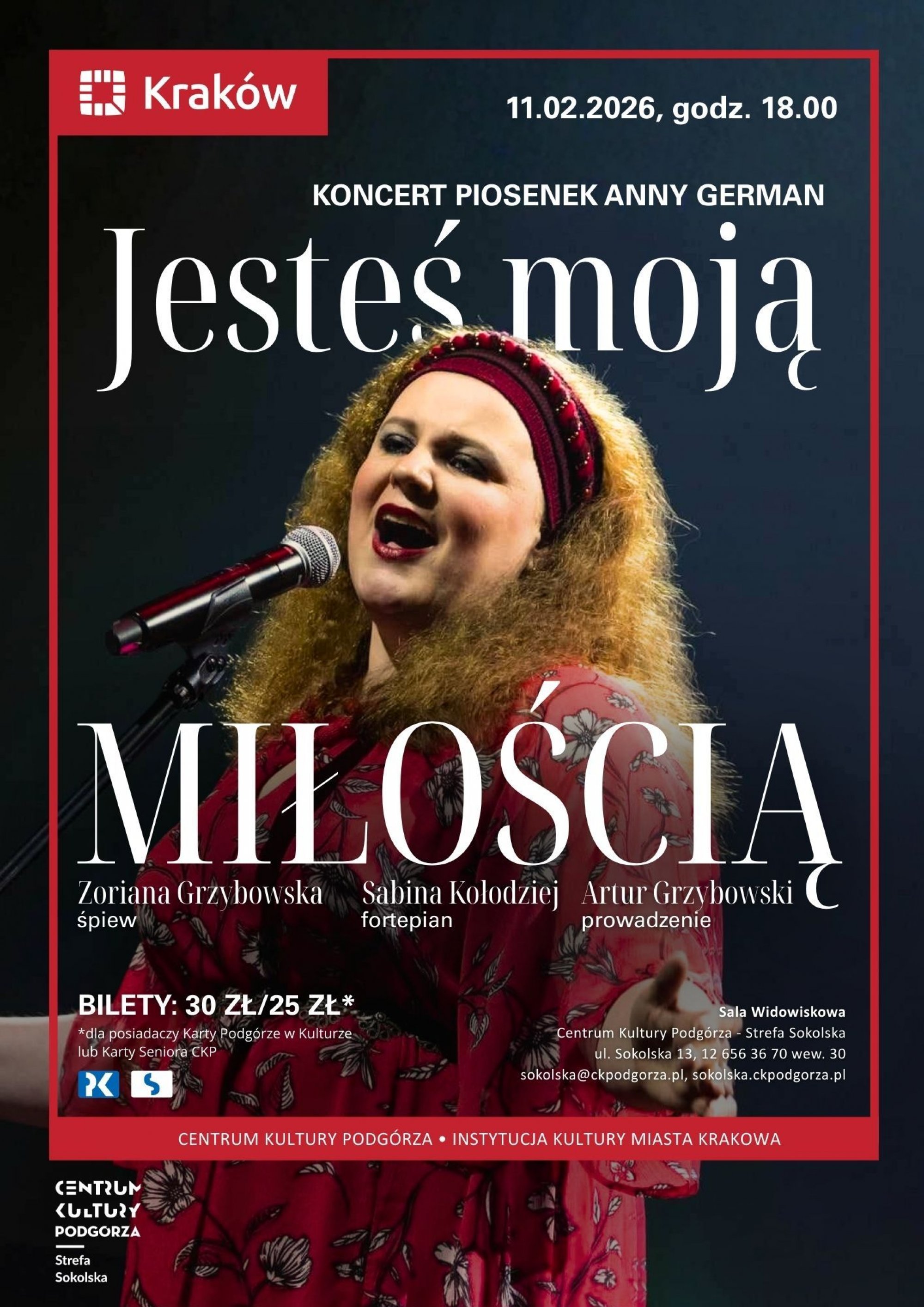 Z okazji 90. rocznicy urodzin Anna German zapraszamy na koncert poświęcony twórczości tej wybitnej artystki. Program zatytułowany „Jesteś moją miłością” obejmuje wybór najpiękniejszych piosenek z jej repertuaru, pełnych liryzmu, wzruszeń i ponadczasowej elegancji.