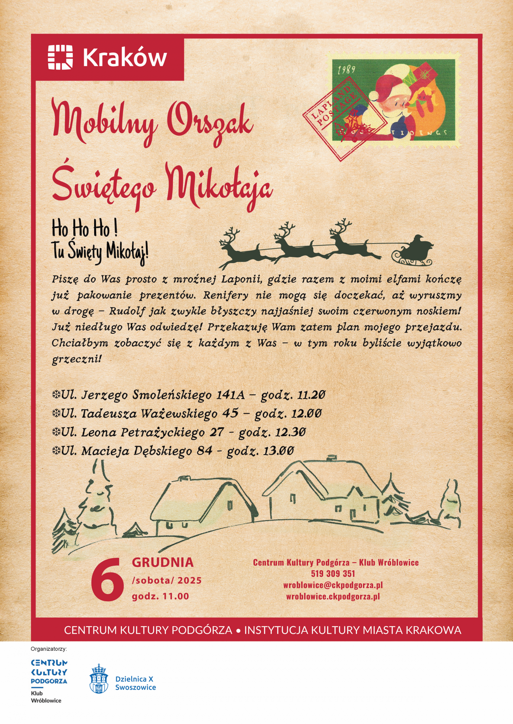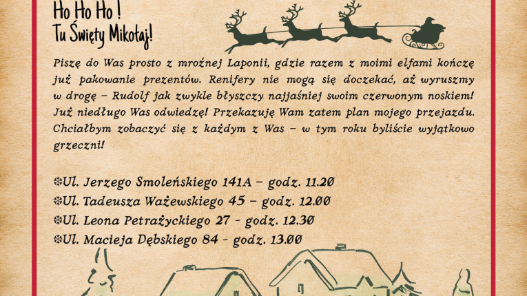 Pisze do Was święty Mikołaj prosto z mroźnej Laponii, gdzie razem z moimi elfami kończę już pakowanie prezentów. Renifery nie mogą się doczekać, aż wyruszmy w drogę, a Rudolf jak zwykle błyszczy najjaśniej swoim czerwonym noskiem ! Już niedługo Was odwiedzę zostawiam wam zatem mój osobisty plan przejazdu, chciałabym zobaczyć się z każdym z was bo widziałem, że w tym roku byliście wyjątkowo grzeczni :)