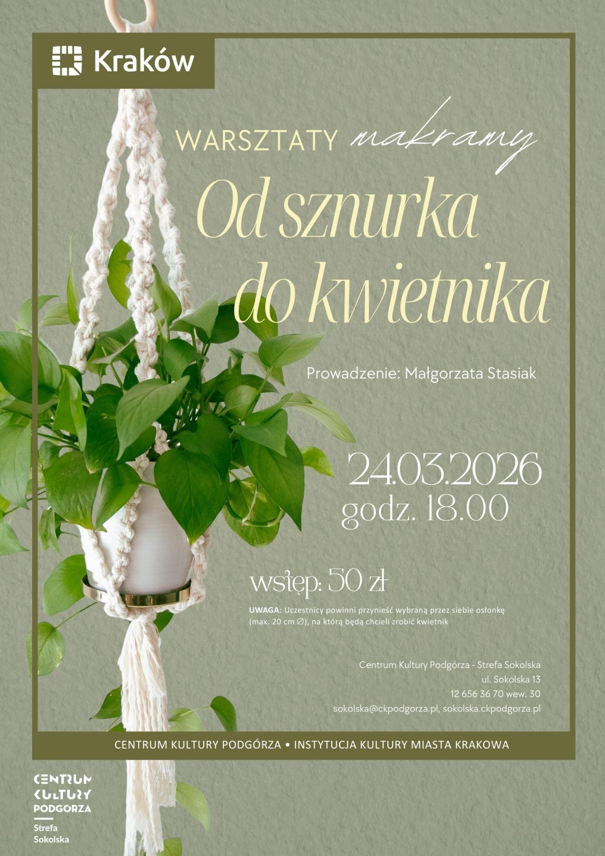 Estetyczny, zielono-biały plakat warsztatów makramy z dużym zdjęciem wiszącej rośliny w plecionym kwietniku po lewej stronie. Na tle o strukturze tynku umieszczono eleganckie, jasne napisy informujące o wydarzeniu oraz logotypy Krakowa i Centrum Kultury P