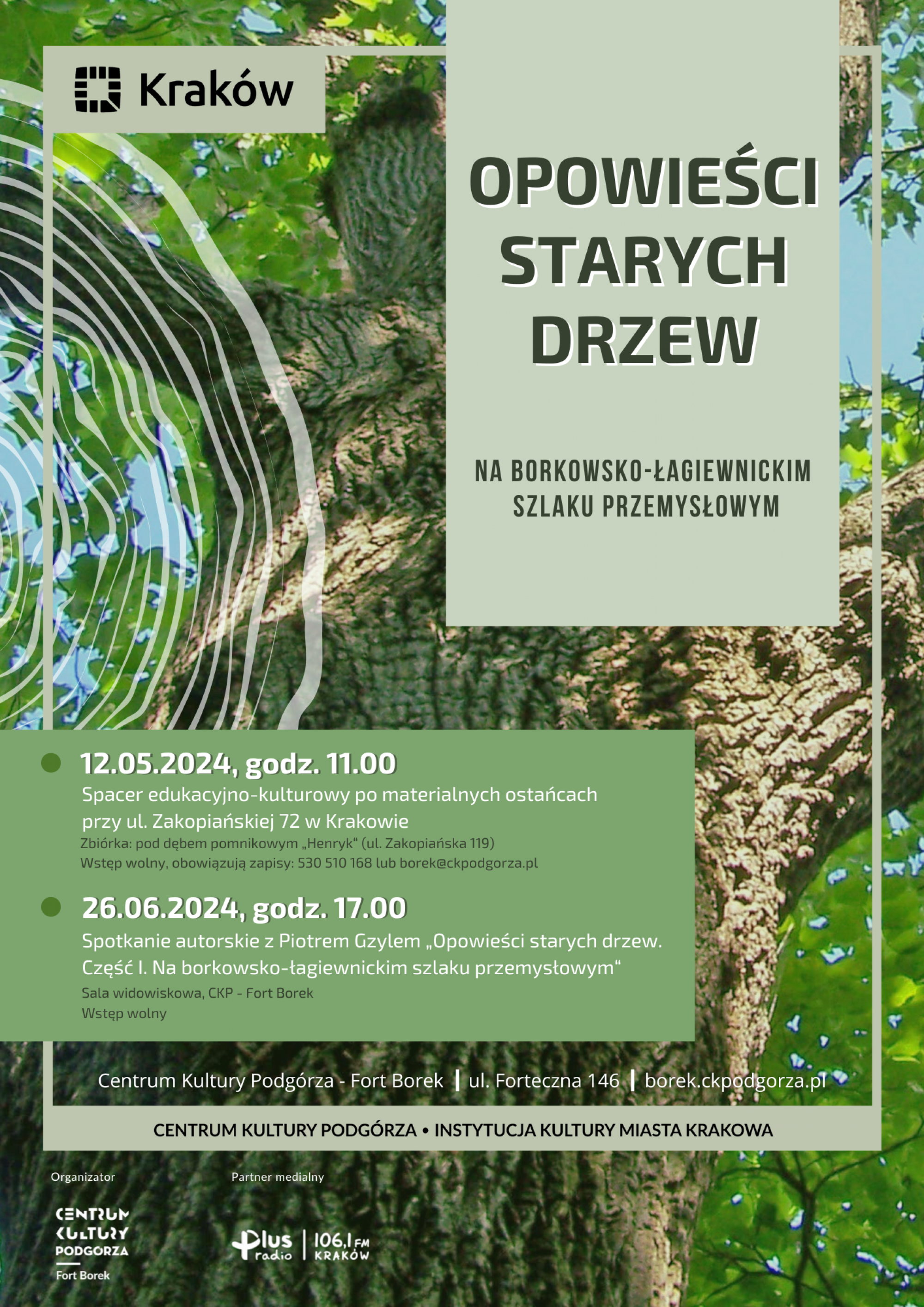 Centrum Kultury Podgórza – Fort Borek zaprasza na wydarzenie „Opowieści starych drzew” w ramach, którego w dniu 12.05.24 o godzinie 11.00 odbędzie się spacer edukacyjno-kulturowy po materialnych ostańcach przy ul. Zakopiańskiej 72 w Krakowie.