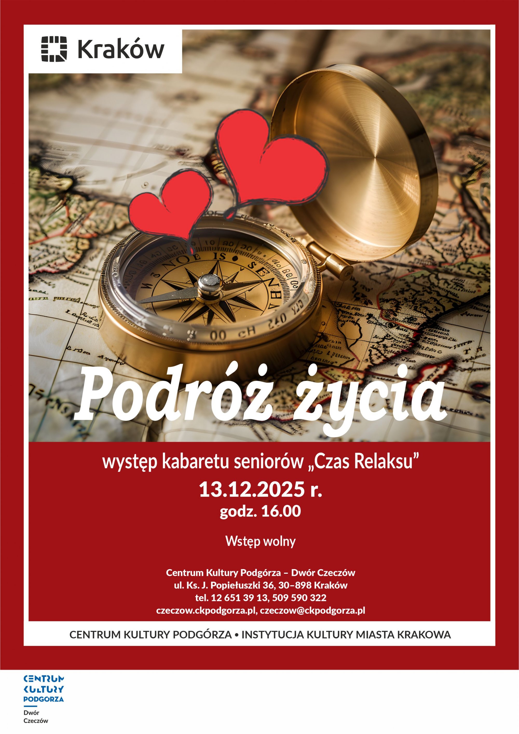 Zapraszamy na występ kabaretu seniorów "Czas Relaksu" pt. "Podroż życia", który odbędzie się w sobotę 13 grudnia 2025 roku o godzinie 16.00 w Dworze Czeczów.