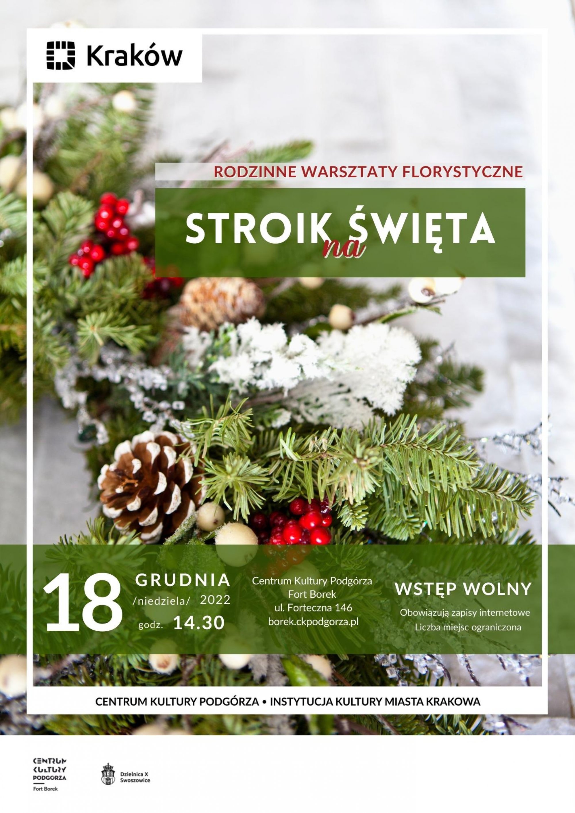 Fort Borek oraz Rada Dzielnicy X Swoszowice zapraszają na Rodzinne warsztaty florystyczne "Stroik na Święta", które odbędą się w Forcie Borek 18.12.2022 r. o godzinie 14.30.
