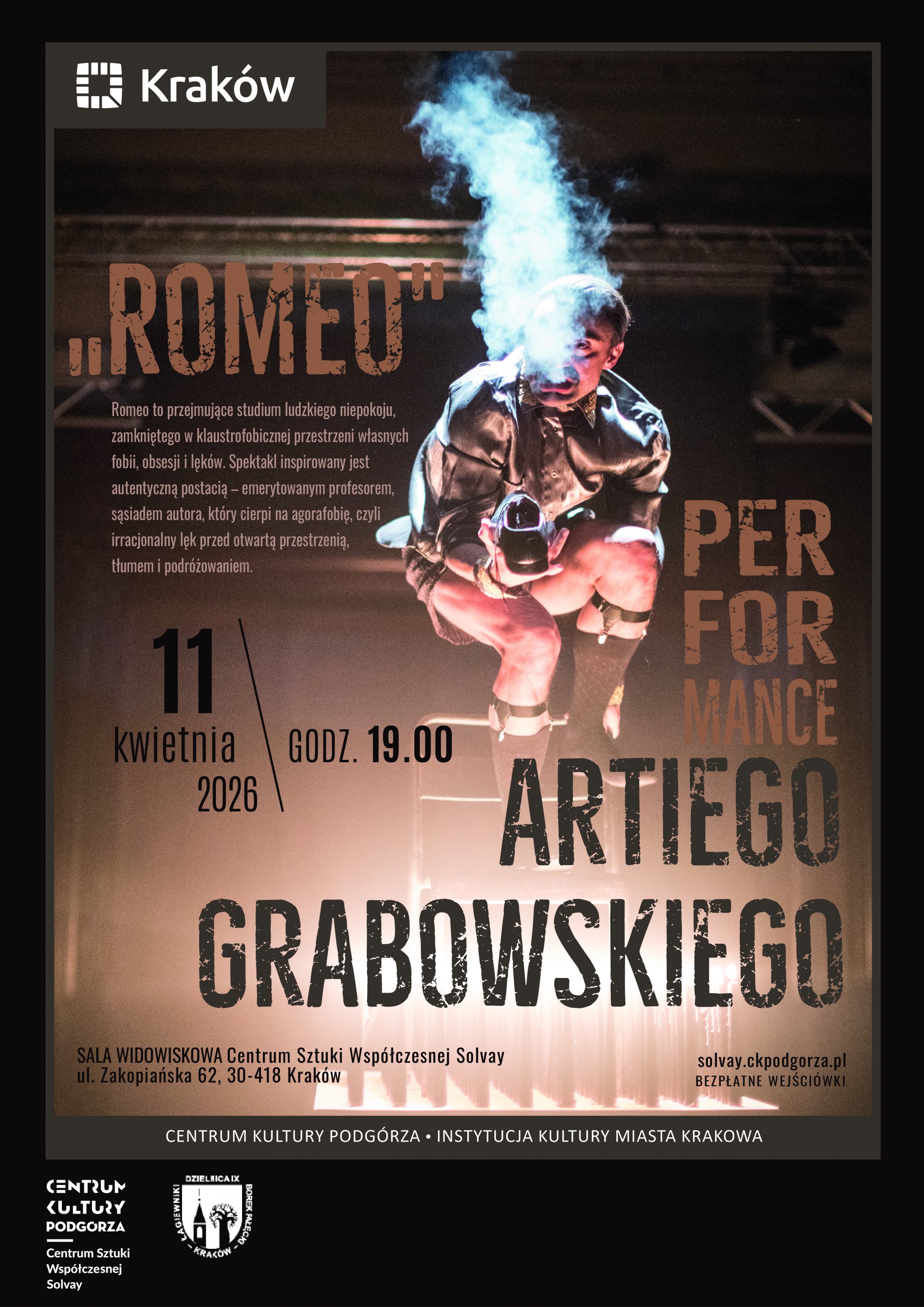 "Romeo" to przejmujące studium ludzkiego niepokoju, zamkniętego w klaustrofobicznej przestrzeni własnych fobii, obsesji i lęków. Spektakl inspirowany jest autentyczną postacią – emerytowanym profesorem, sąsiadem autora, który cierpi na agorafobię, czyli irracjonalny lęk przed otwartą przestrzenią, tłumem i podróżowaniem. Całe swoje życie zewnętrzne ogranicza do dwóch metrów kwadratowych – balkonu trzeciego piętra amfilady kamienicy, który staje się jego osobistą mównicą, proscenium, sceną teatralną, a zarazem więzieniem bez drogi ucieczki.