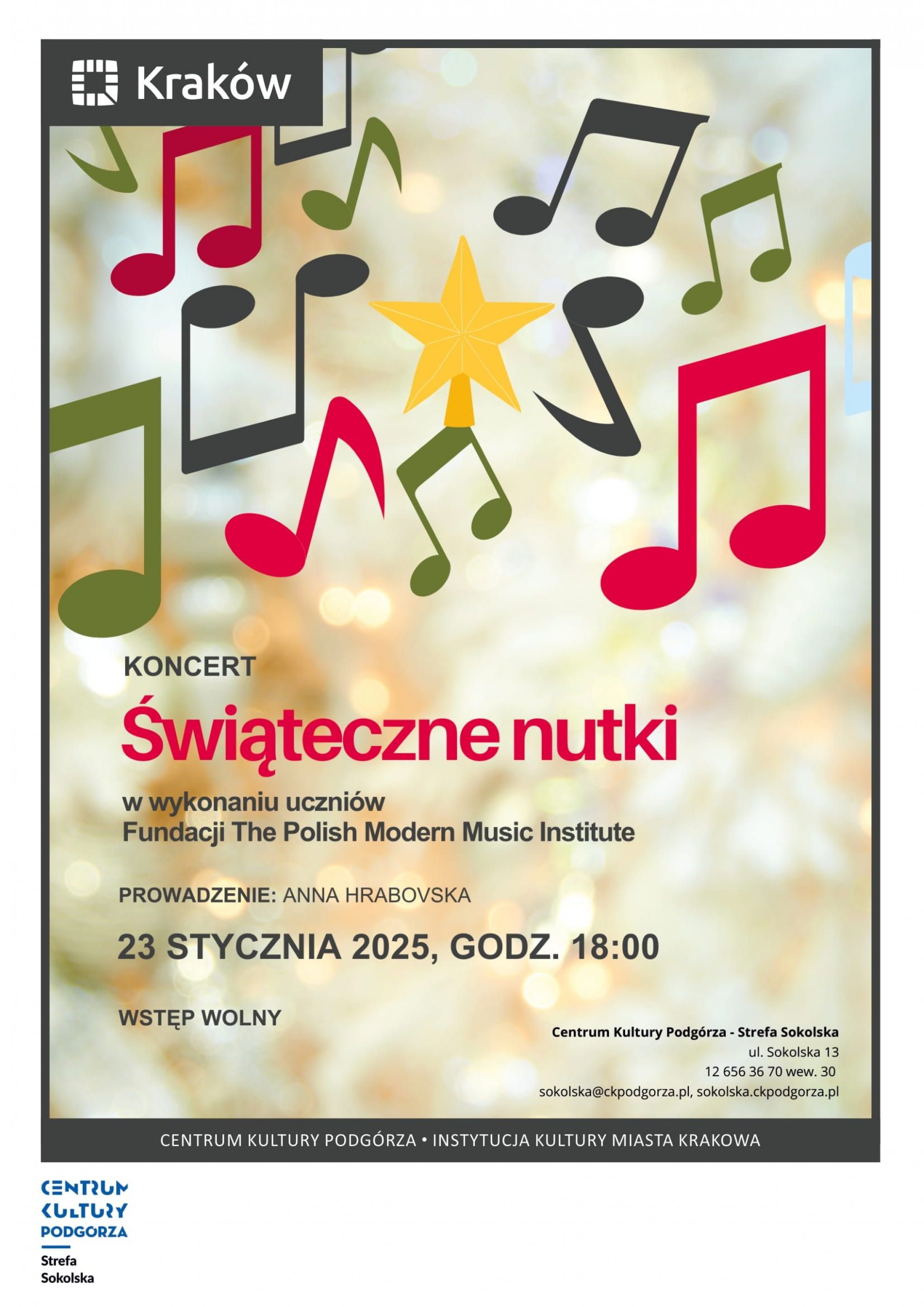 Zapraszamy na koncert pt. "Świąteczne nutki" w wykonaniu uczniów Fundacji The Polish Modern Music Institute. W programie znajdą się kolędy i utwory muzyczne w wykonaniu uczniów ogniska muzyczno-artystycznego PMMI Academy. Koncert poprowadzi Anna Hrabovska.