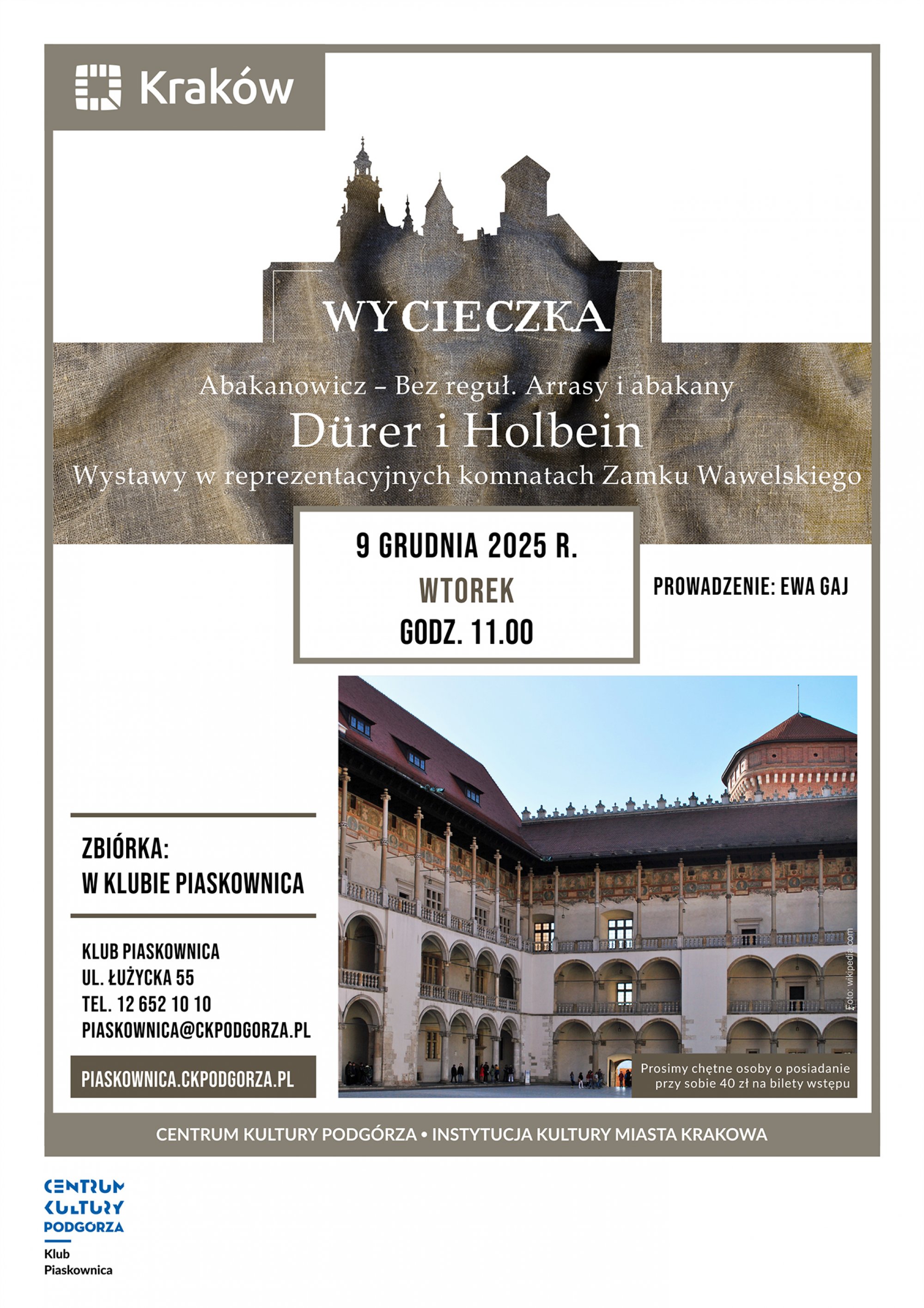 „Abakanowicz. Bez reguł. Arrasy i abakany na Wawelu„, „Dürer i Holbein na Wawelu„, czyli wystawy w reprezentacyjnych komnatach Zamku Wawelskiego.