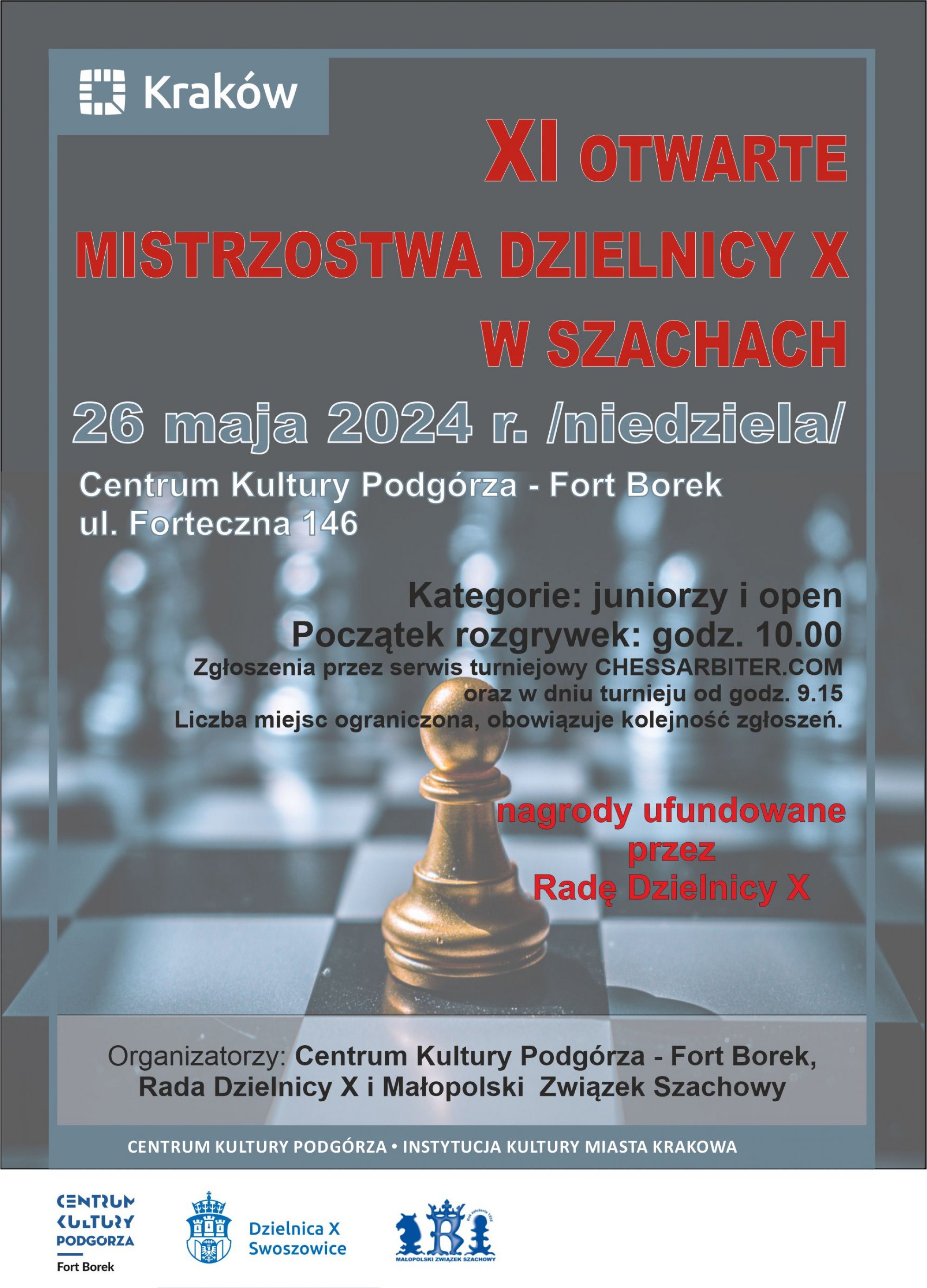 Fort Borek, Rada Dzielnicy X Swoszowice oraz Małopolski Związek Szachowy zapraszają do udziału w XI Otwartych Mistrzostwach Dzielnicy X w Szachach, które odbędą się 26 maja 2024 r. w godz. 9:00-14:00.