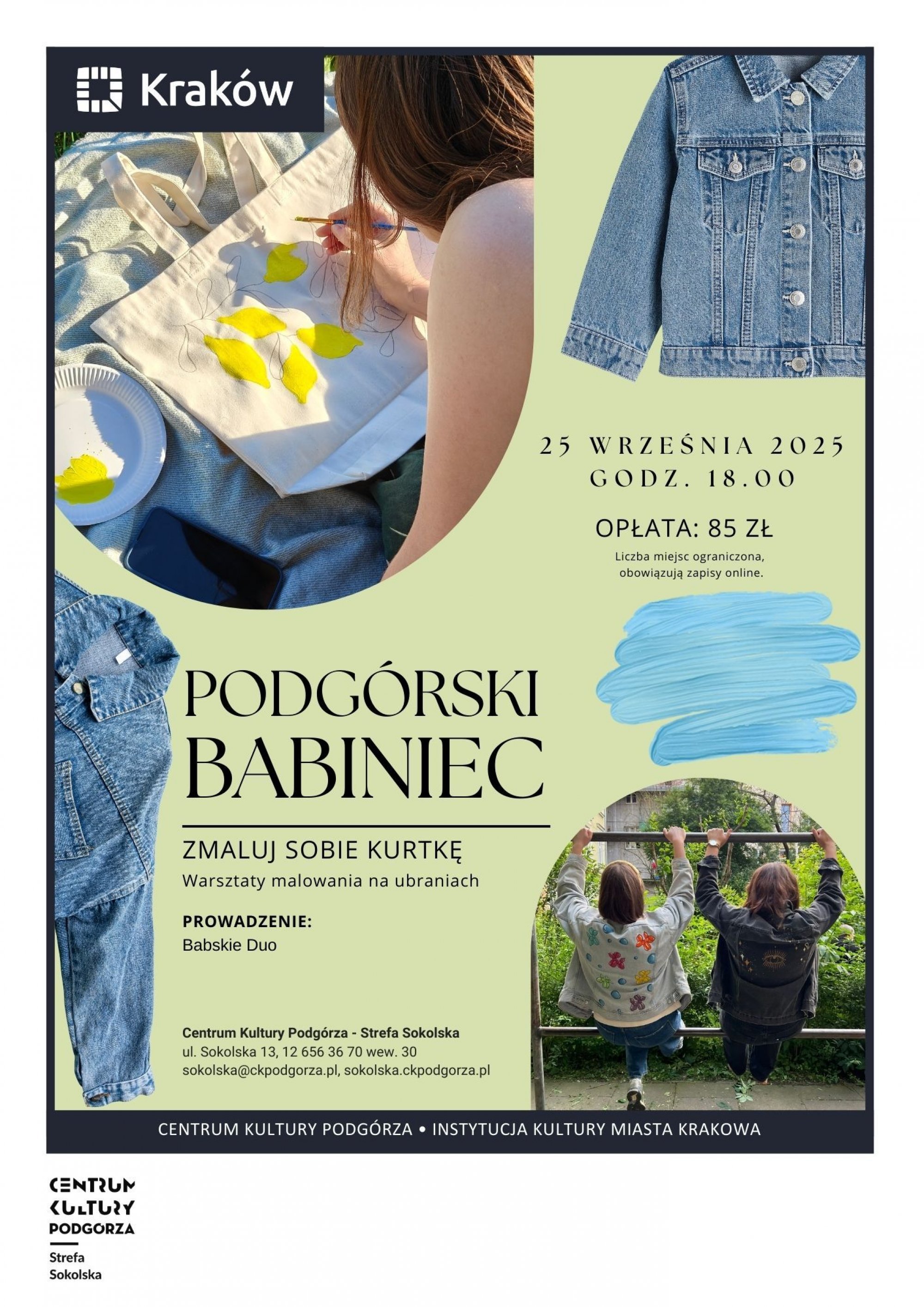 Chcesz stworzyć coś niepowtarzalnego i w pełni swojego? Weź udział w warsztatach „Zmaluj sobie kurtkę” i daj nowe życie swojej garderobie! To kreatywna przestrzeń, w której Twoja wyobraźnia spotka się z farbami, pędzlem i… modą. Pod czujnym okiem prowadzących z Babskiego Duo nauczysz się, jak przenieść swój pomysł na jeansową kurtkę, koszulkę, torbę czy czapkę.